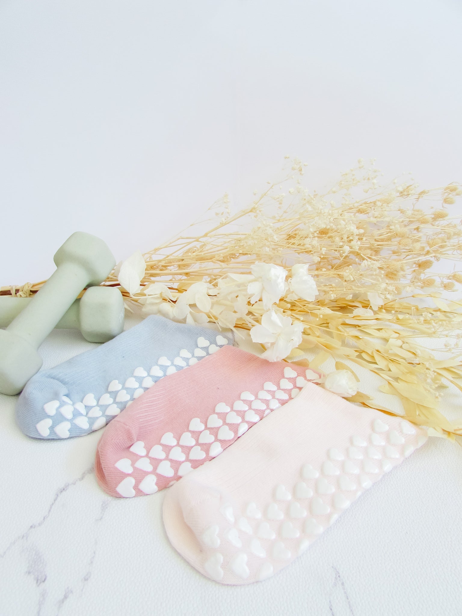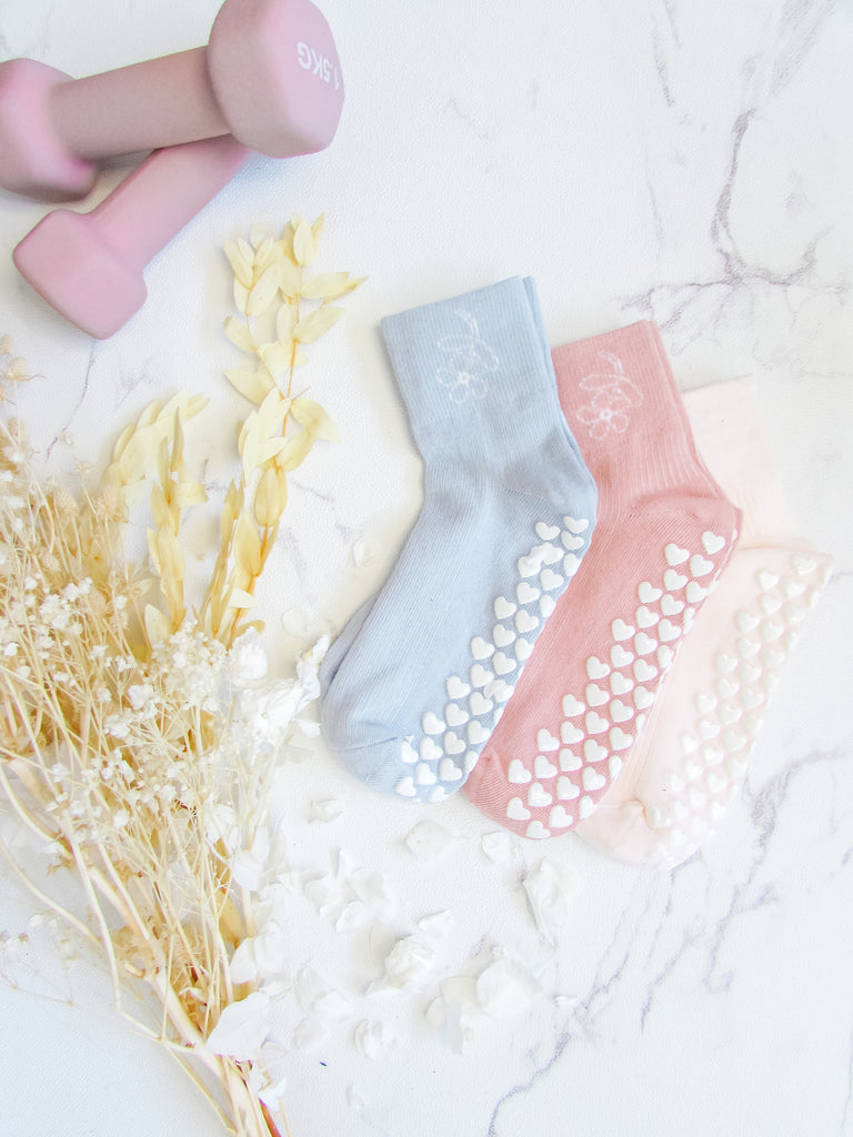 The High Rise Pastel Sock Bundles includes 3 beautiful shades (Blush, Baby Pink & Dusty Blue) with a tighter fit just above the ankle. They are designed to wear over the top or under tights or with shorter length tights/shorts. These socks are breathable to reduce sweat build up and increase hygiene all while feeling extra supportive and grippy during your next session! Where comfort meets functionality!
